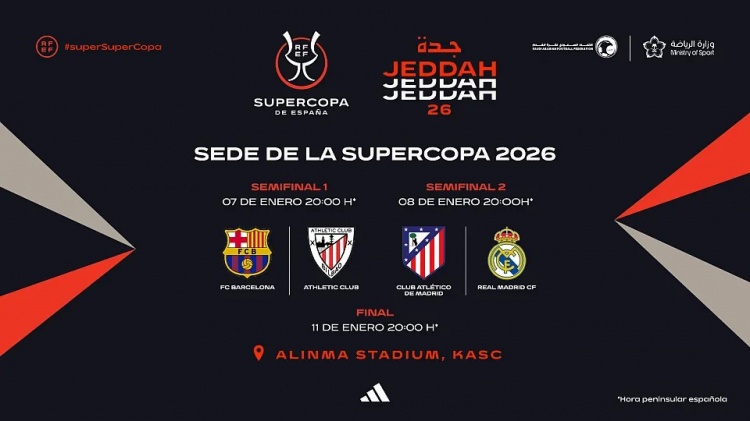 10月7日訊 西班牙足協(xié)官方公布了西班牙超級(jí)杯賽程,所有比賽都將在沙特吉達(dá)的國(guó)王阿卜杜拉體育城進(jìn)行。