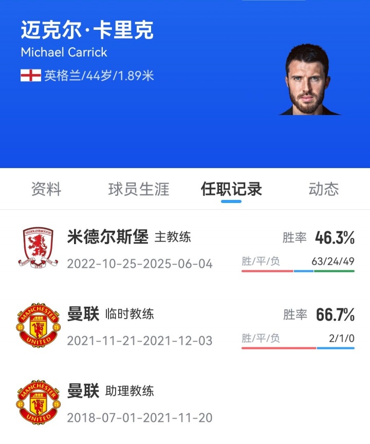 卡里克球員時(shí)期在曼聯(lián)效力12年,2018年在曼聯(lián)退役后就在球隊(duì)擔(dān)任助教,輔佐索爾斯克亞。2021年索爾斯克亞下課后,卡里克擔(dān)任臨時(shí)主帥帶隊(duì)3場(chǎng),曼聯(lián)取得2勝1平的戰(zhàn)績(jī),之后朗尼克接手曼聯(lián),卡里克也離開(kāi)了教練組。
