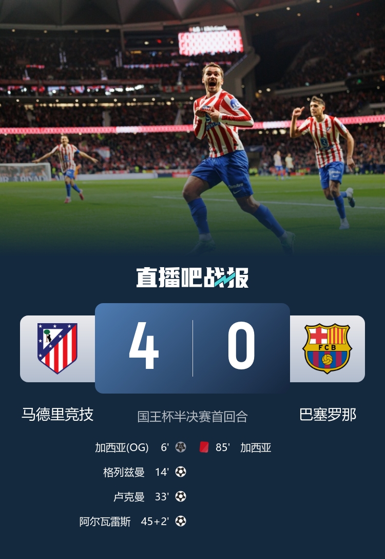 霍安失誤送禮,阿爾瓦雷斯、盧克曼互相傳射,庫巴西進(jìn)球被吹引爭議,埃里克·加西亞染紅;國王杯半決賽次回合3月4日移師諾坎普。